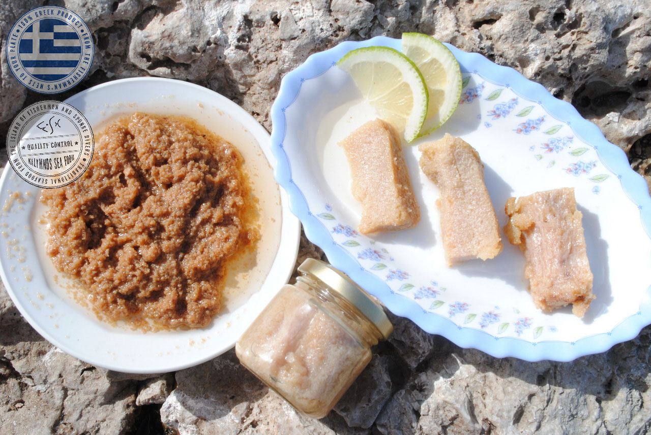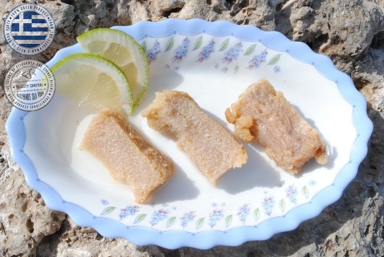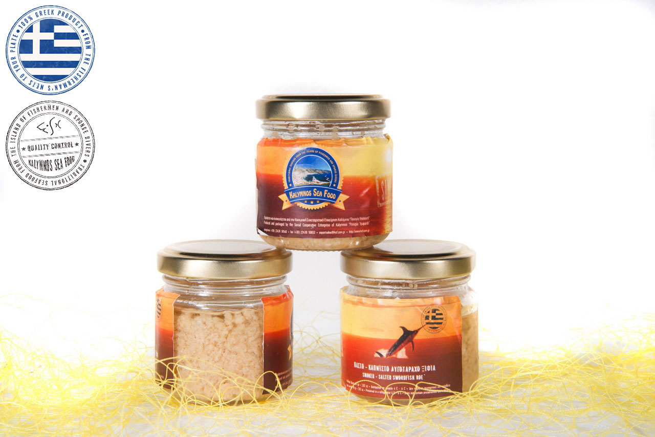The swordfish roe is removed by the fishermen immediately after the catch while the fish is still alive, wrapped in a special membrane, tucked away in ice and delivered to our packaging facility within 12 hours. Then the fishermen’s’ women do what they do best, processing and smoking the product (thyme, savory, oregano, products from the mountains of Kalymnos) before the packaging in glass jars sealed with the vacuum method, thus ensuring that the product maintains its superior product quality, therefore creating a global originality in products of superior quality compared to roe that we know today.