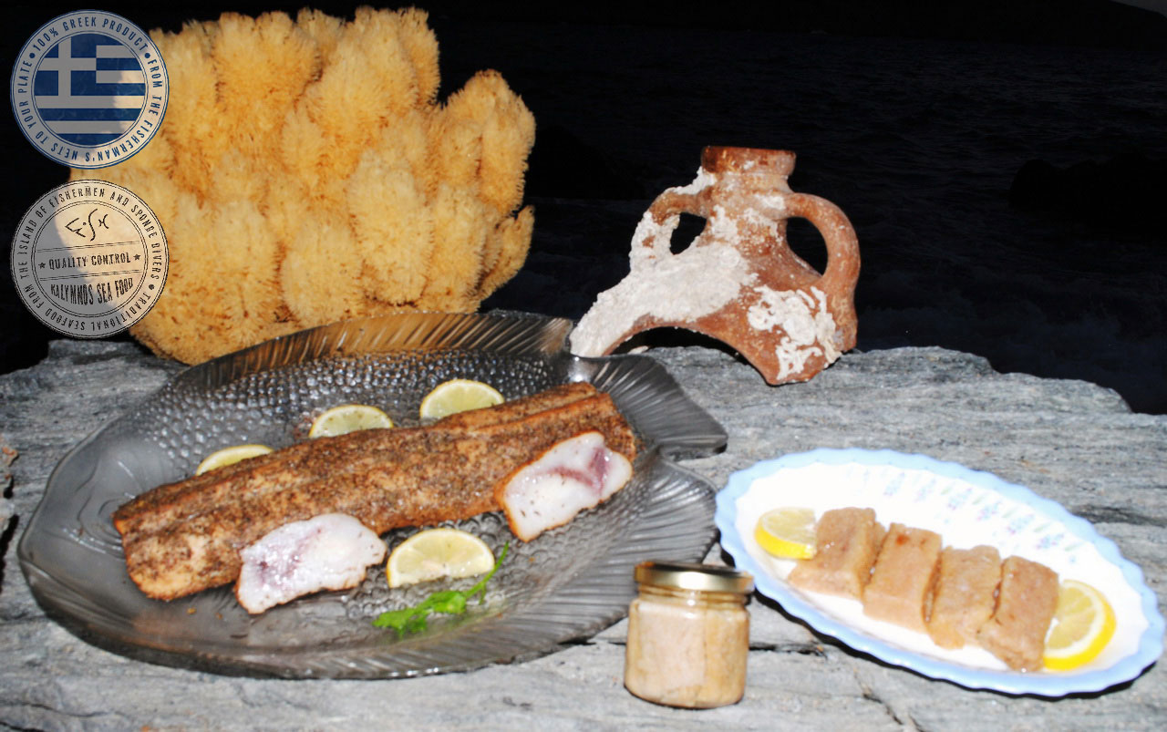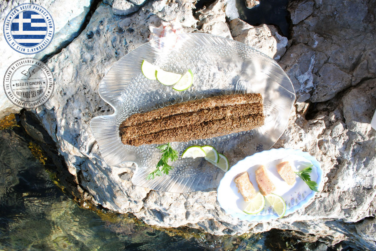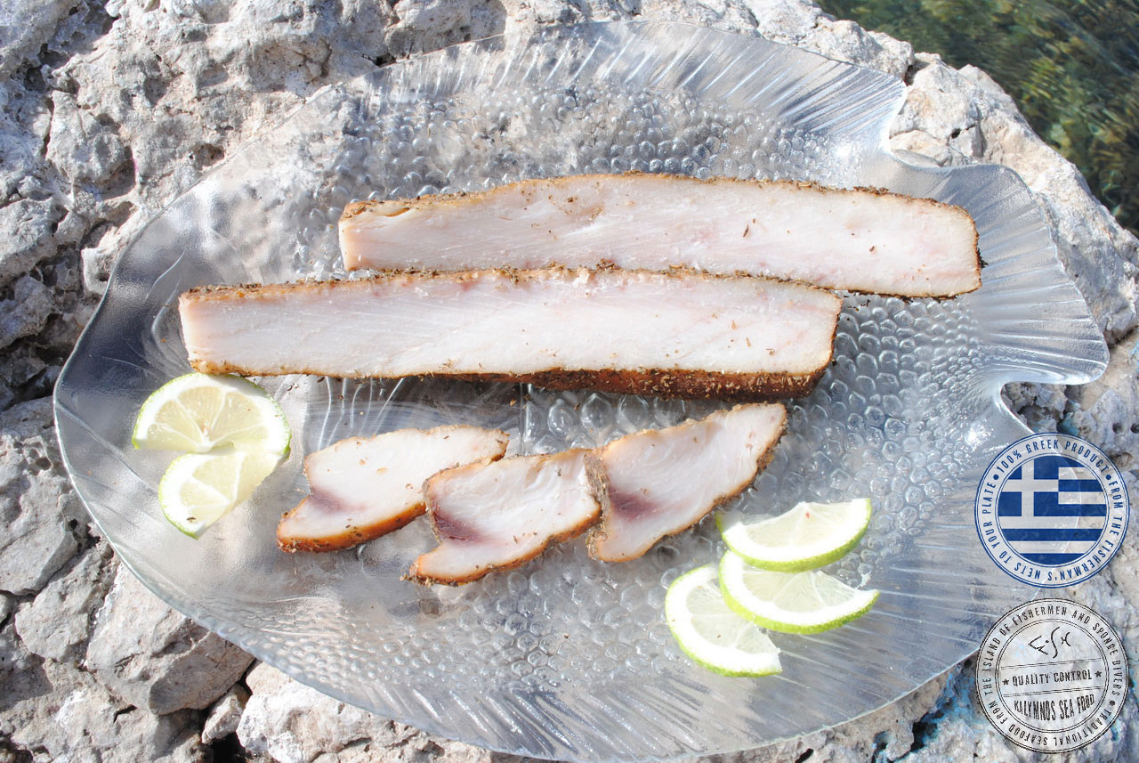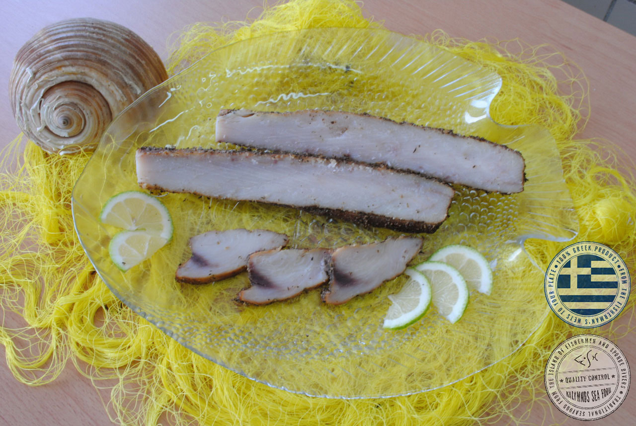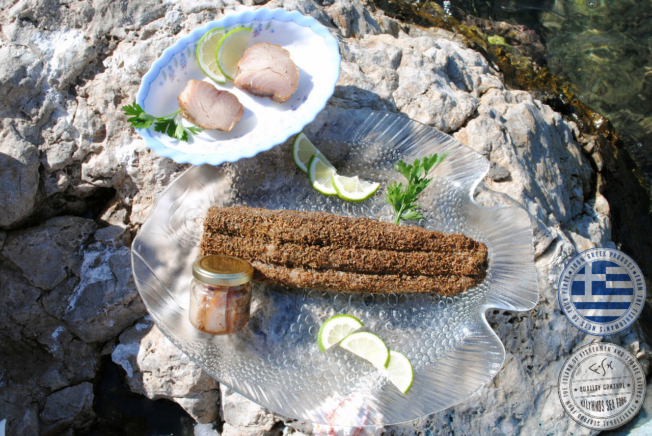 This island of Kalymnos produces 70% of the Pan-Hellenic production of swordfish, a fleet of 720 fishing vessels and their daily catch delivered to Kalymnos. The fishermen’s women make chose from the daily catch what will be used for production (fish caught under 24 hours). The women at the packaging facility will wash them, remove the skin, filet them, salt them with natural salt and smoke the fish with flavors (thyme, savory, oregano, products from the mountains of Kalymnos) and then package them in sealed glass jars using the vacuum method thus ensuring that the product maintains its superior product quality.