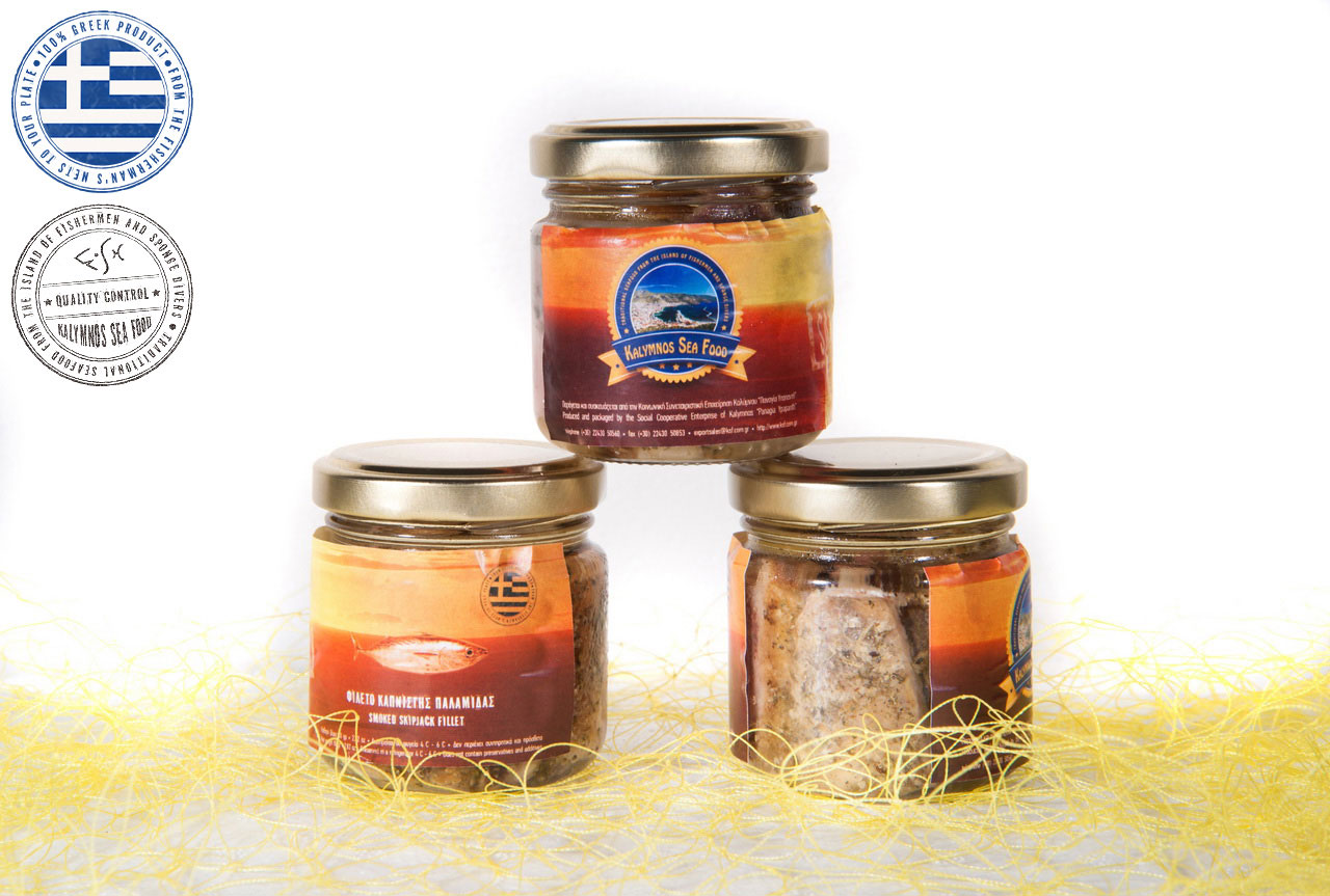 These fish are fished in the sea area near Kalymnos, around the small uninhabited islets by small coastal vessels and delivered within the same day to our facilities were our women wash the fish, fillet them and remove the skin. The fish are then salted with natural salt, then smoked with flavors from (thyme , savory, oregano, products from the mountains of Kalymnos) and then the packaged in glass jars sealed with the vacuum method thus ensuring that the product maintains its superior product quality.